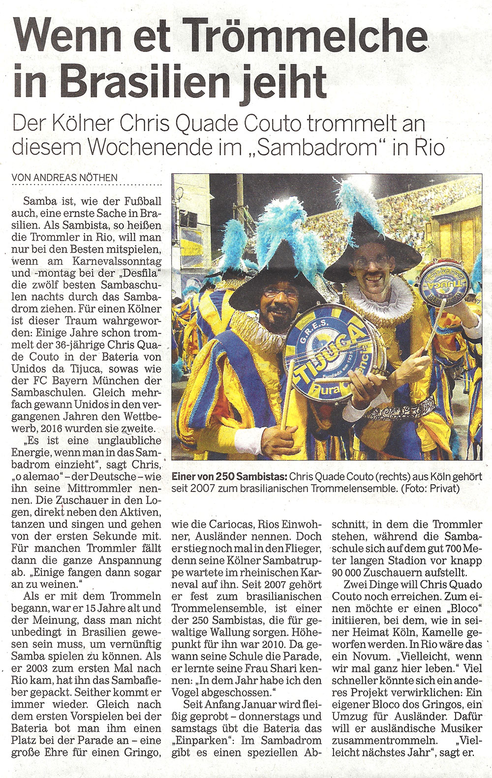 Chris works as a musician and teacher of brazilian percussion, as a producer of cultural events and CEO of the town twinning association Köln-Rio e.V.